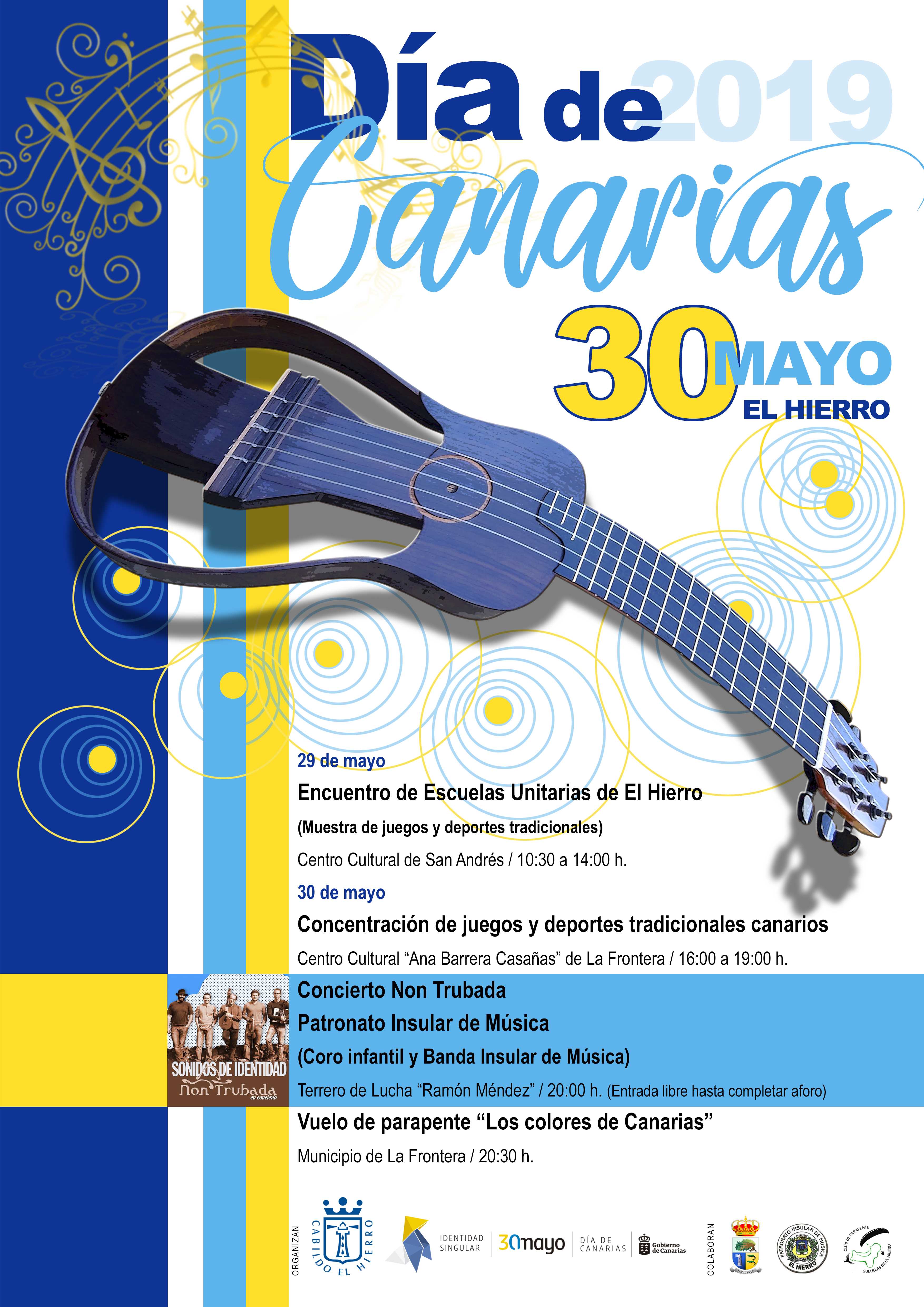 El Hierro se dispone a celebrar este 30 de Mayo, Día de Canarias, fusionando la cultura con el deporte tradicional y el vuelo en parapente como la mejor forma de poner en valor “Los colores de Canarias”. El Cabildo de El Hierro y el Gobierno de Canarias, con la colaboración de los tres ayuntamientos insulares, el Patronato Insular de Música y el Club de Parapente Guelillas de El Hierro han programado una serie de actos que se iniciarán mañana miércoles, 29 de mayo, de 10:30 a 14:00 horas, con un Encuentro entre el alumnado de las Escuelas Unitarias de El Hierro en el Centro Cultural de San Andrés con el objetivo de disfrutar de una muestra de juegos y deportes tradicionales en el pueblo ganadero por excelencia de la isla y punto neurálgico de su geografía. Una jornada que el área de Cultura del Cabildo herreño aprovechará para presentar los resultados de su proyecto “Tenemos lana en la isla”, una iniciativa educativa destinada a fomentar entre los niños los espacios manipulativos que ayudan a su madurez cerebral, propiciar formas de expresión creativa, que ayuda a exteriorizar los mundos emotivos, actualizar y revalorizar un patrimonio cultural, la presentación de la lana como recurso educativo, intercambio generacional, creando espacios alrededor de este material fomentando los oficios agrícolas, ganaderos y artesanos”. Ya el jueves, el gran día de la Comunidad, los herreños podrán participar también de una gran concentración de juegos y deportes tradicionales canarios, esta vez en el Centro Cultural Ana Barrera Casañas de La Frontera, de 16 a 19:00 horas. Posteriormente, a las 20:00 horas, en el terrero de lucha a cielo abierto “Ramón Méndez” de La Frontera, con entrada libre hasta completar aforo, se podrá disfrutar de lo mejor de los sonidos de la cultura e identidad canaria de manos del grupo de folk canario Non Trubada, acompañados por la actuación del coro infantil y Banda del Patronato de Música de El Hierro. Durante el espectáculo, y por primera vez en El Hierro, se escuchará la canción de Non Trubada dedicada a la isla con motivo de la última erupción submarina, “Volcán de Las Calmas”. Todo ello acompañado, a partir de las 20:30 horas, de un espectáculo único de vuelo en parapente, “Los Colores de Canarias”, de manos del Club de Parapente Guelillas de El Hierro.